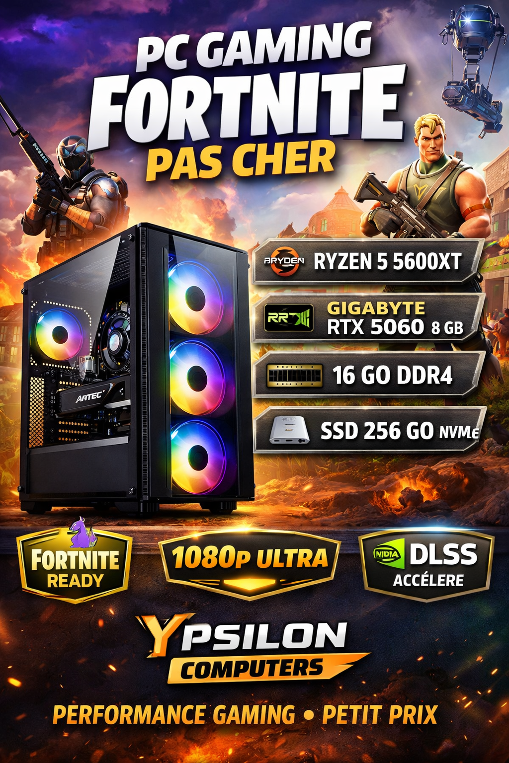 PC Gaming Fortnite Pas Cher – Ryzen 5 5600XT • RTX 5060 • 16 Go DDR4 • SSD 256 Go